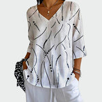 Bijela bluzica s crnim prugama i točkicama savršen je spoj jednostavnosti i elegancije. V-izrez dodaje ženstvenost, dok udoban materijal čini je idealnom za svakodnevnu upotrebu, ali i za sofisticiranije prilike.