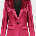 Impresivno sako s baršunastom teksturom koje pruža luksuz i eleganciju svakoj pojavi. Njegov klasični ovratnik u kombinaciji s jednim dugmetom na prednjem dijelu stvara ravnotežu između bezvremenskog i modernog stila. Idealno za večernje izlaske ili posebne prilike.