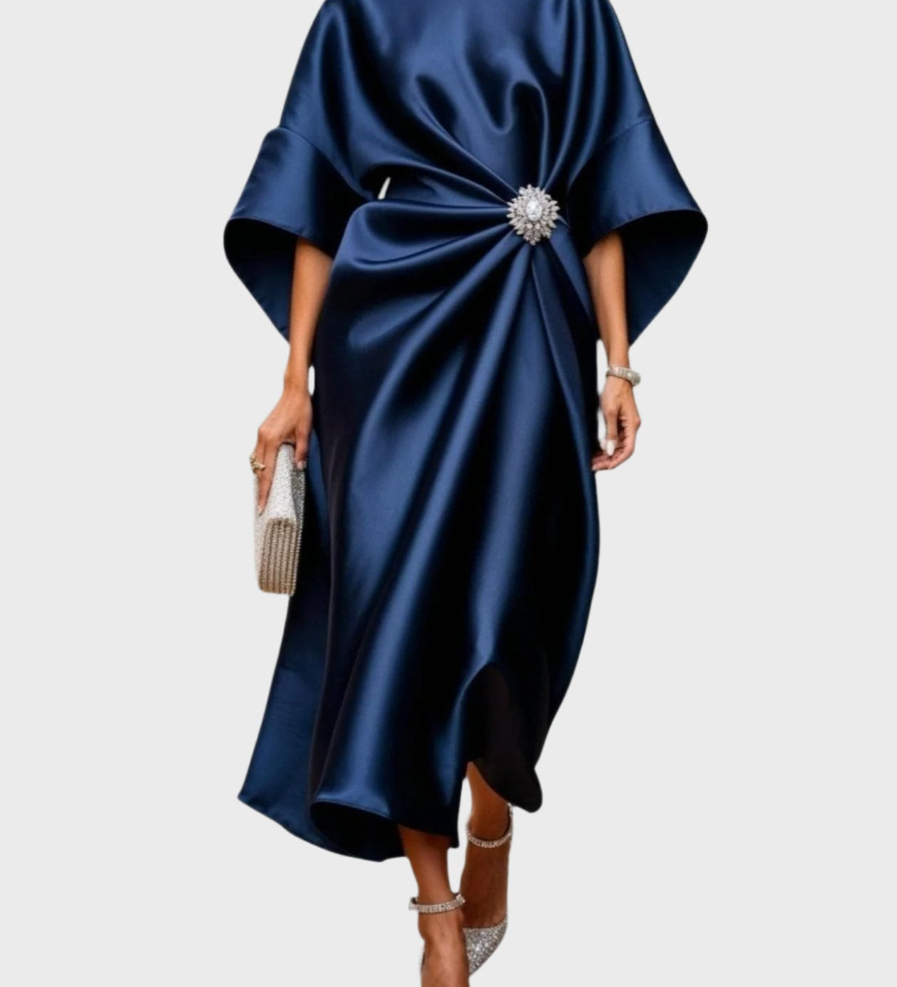 Saten Haljina s Bočnim Plisiranjem i Dekorativnom Kopčom