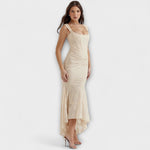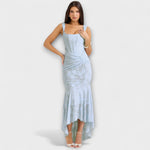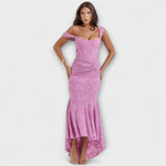Ova prekrasna duga haljina u mekoj ljubičastoj boji kombinira eleganciju i ženstvenost, s romantičnim detaljima i krojem koji obavija tijelo. Korset s drapiranim dizajnom ističe struk, dok asimetrična suknja dodaje pokret i gracioznost svakom vašem koraku.