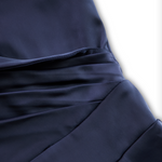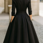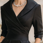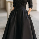 Mooyius predstavlja haljinu midi u vintage stilu od crnog satena—vremenski neprolazna utjelovljenje elegancije i gracije. Izrađena od luksuznog materijala sličnog satenu, ova haljina ima drapirani šal ovratnik koji nježno okviruje dekolte, uz prilagođeni gornji dio i voluminoznu A-liniju suknje.